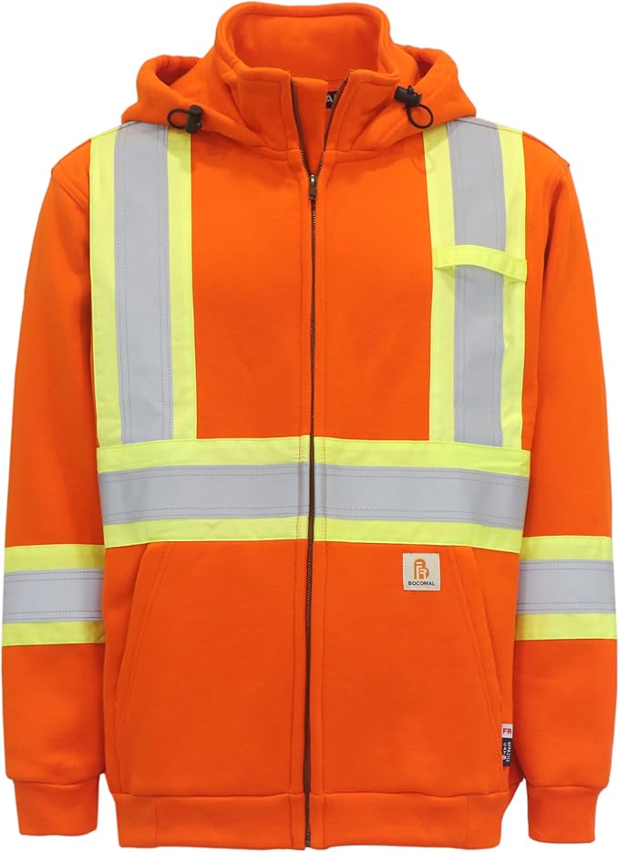 BOCOMAL FR Hoodies High Visibility 14oz Fleece Heavyweight Hi-vis Jackets Flame Resistant Reflective Hooded Sweatshirts